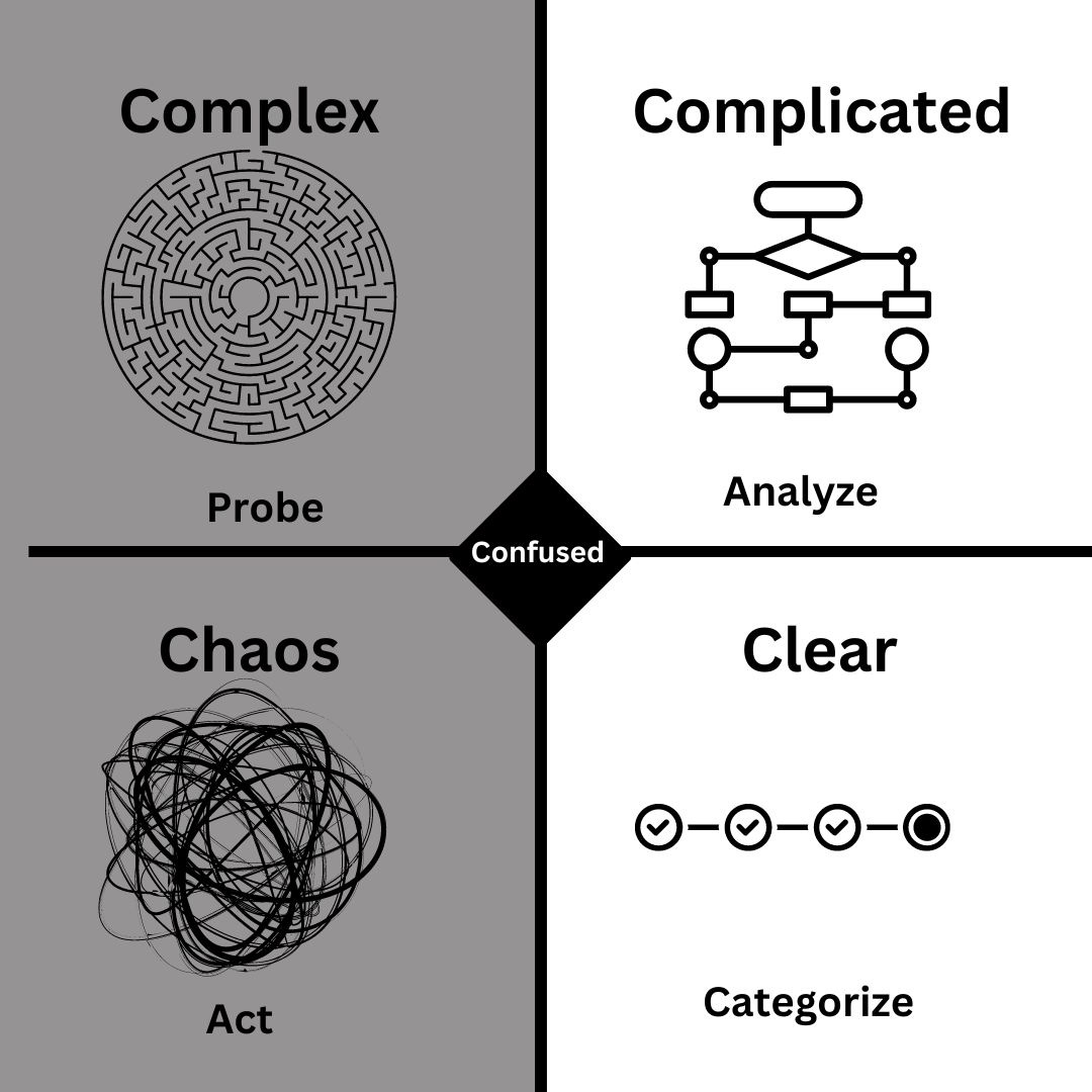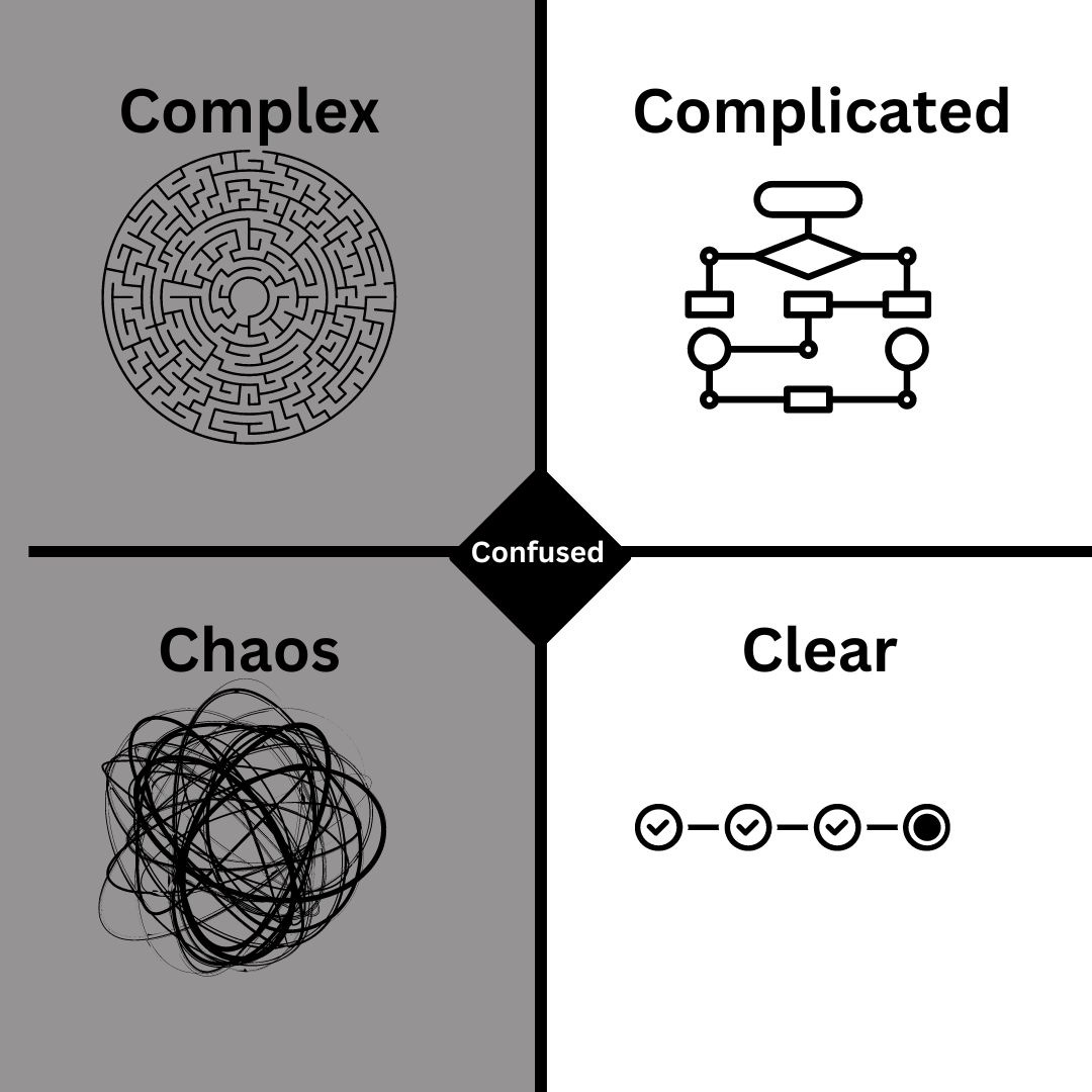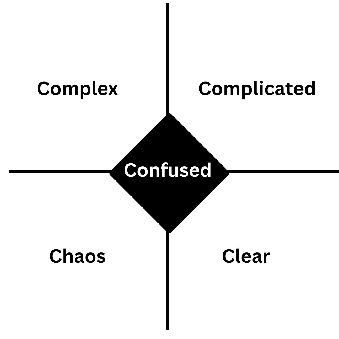 The Confused Domain is the starting point, when there is no clarity about which domain applies. The first step is for decision-makers to move from confused to a particular domain. This is done by looking for a relationship between cause and effect in the problem space.