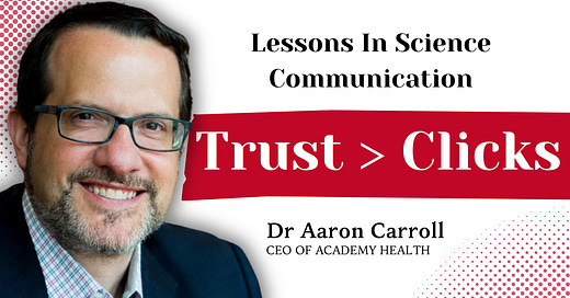 Dr Aaron Carroll, pediatrician, professor, president and CEO of Academy Health, and renowned science communicator, discusses the art and science of effective communication in healthcare. Learn how he developed his skills through years of dedicated practice at the Incidental Economist, to global reach at the New York Times. He reflects on the challenges of translating complex research into accessible content, and why building trust is essential for changing minds.